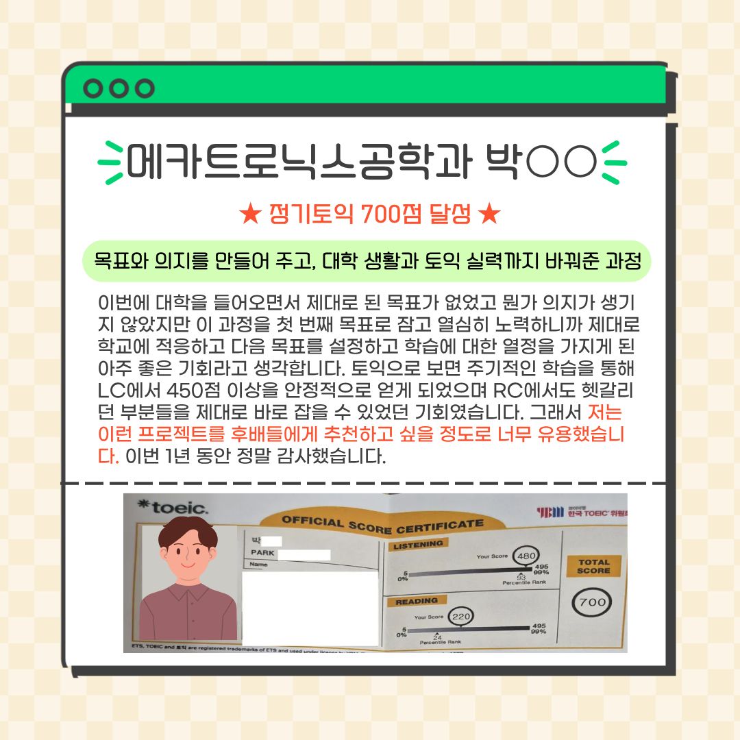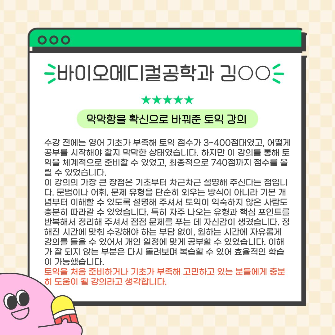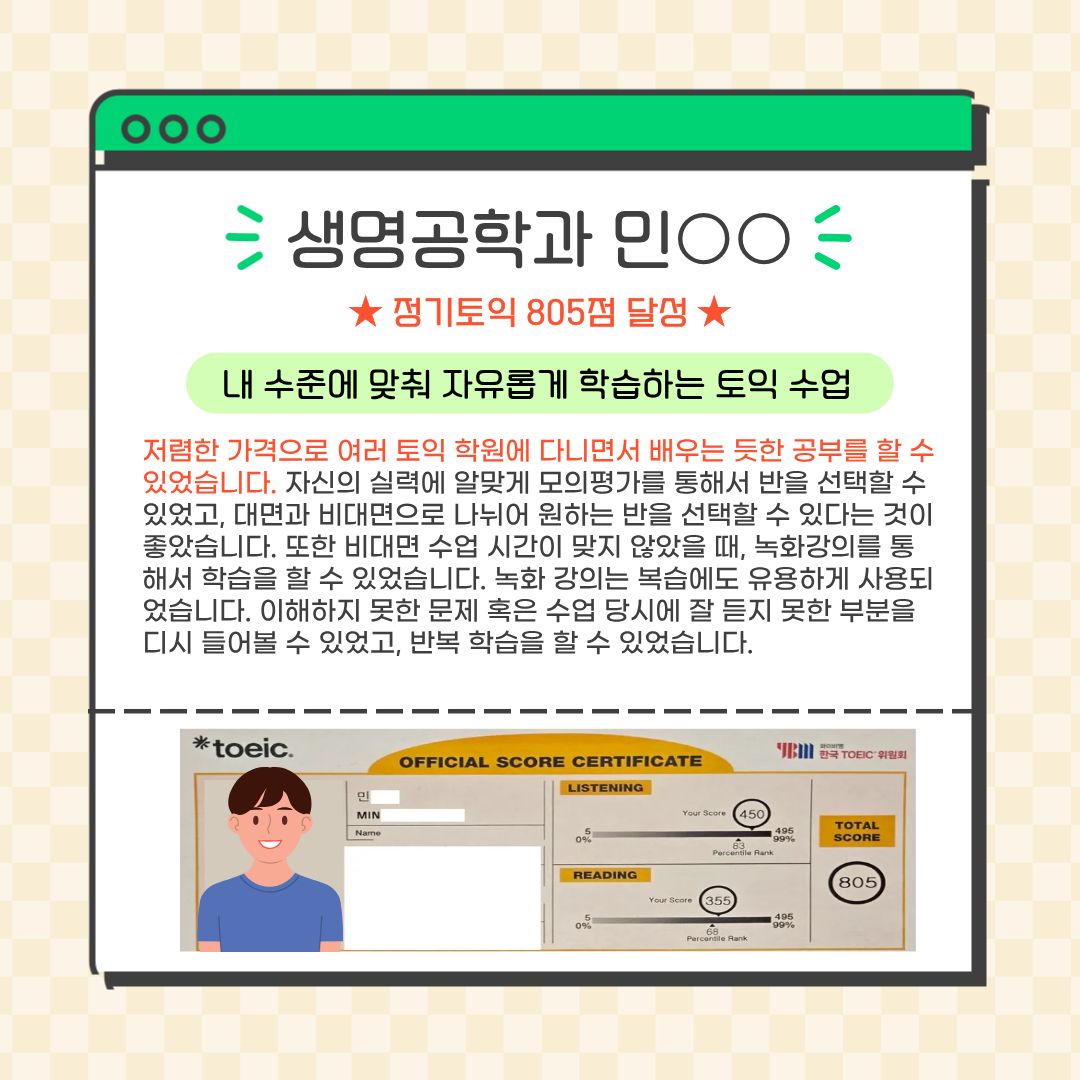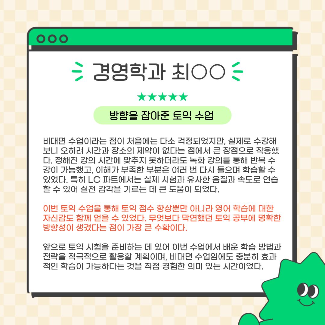 이번 토익 수업을 통해 토익 점수 향상뿐만 아니라 영어 학습에 대한 자신감도 함께 얻을 수 있었다. 무엇보다 막연했던 토익 공부에 명확한 방향성이 생겼다는 점이 가장 큰 수확이다.