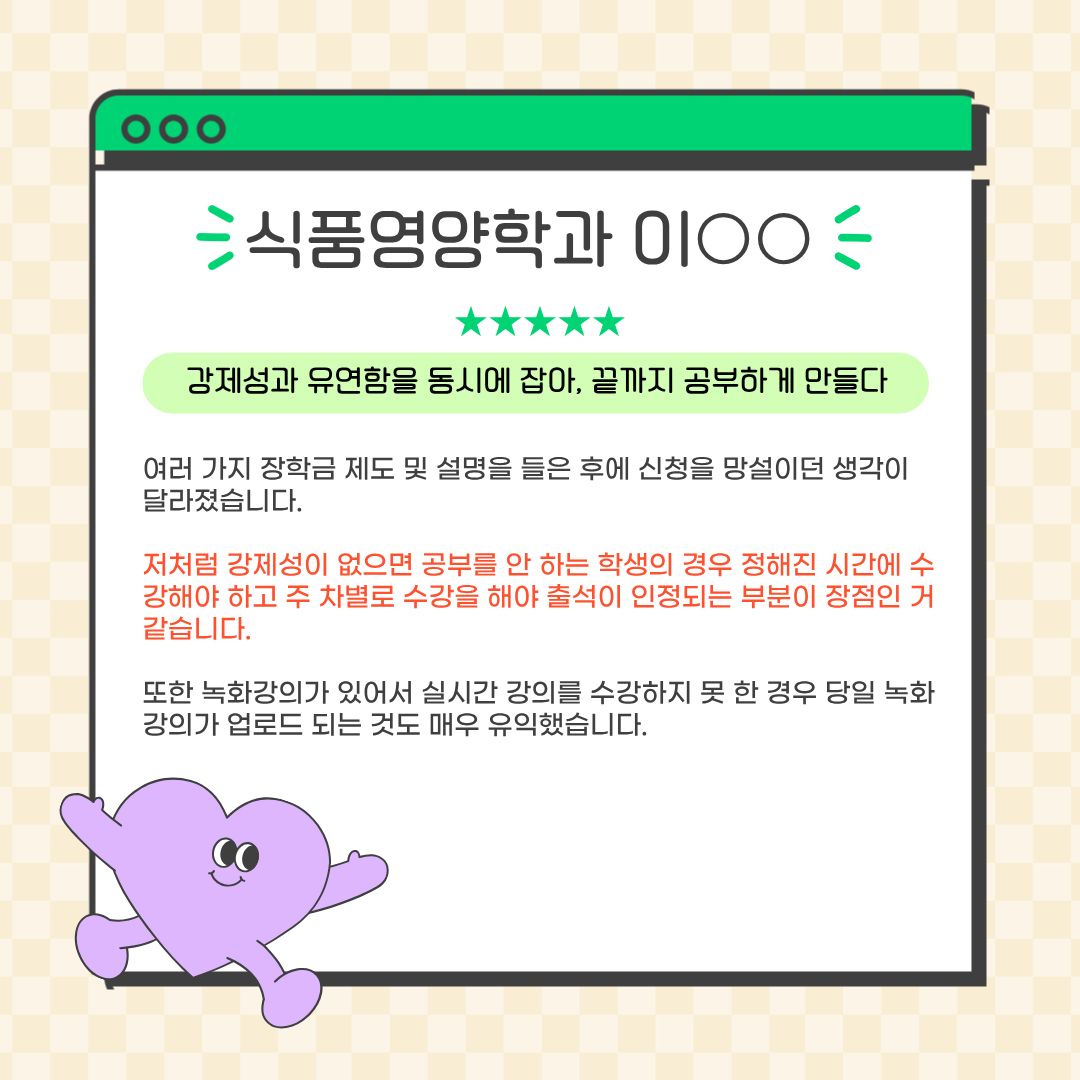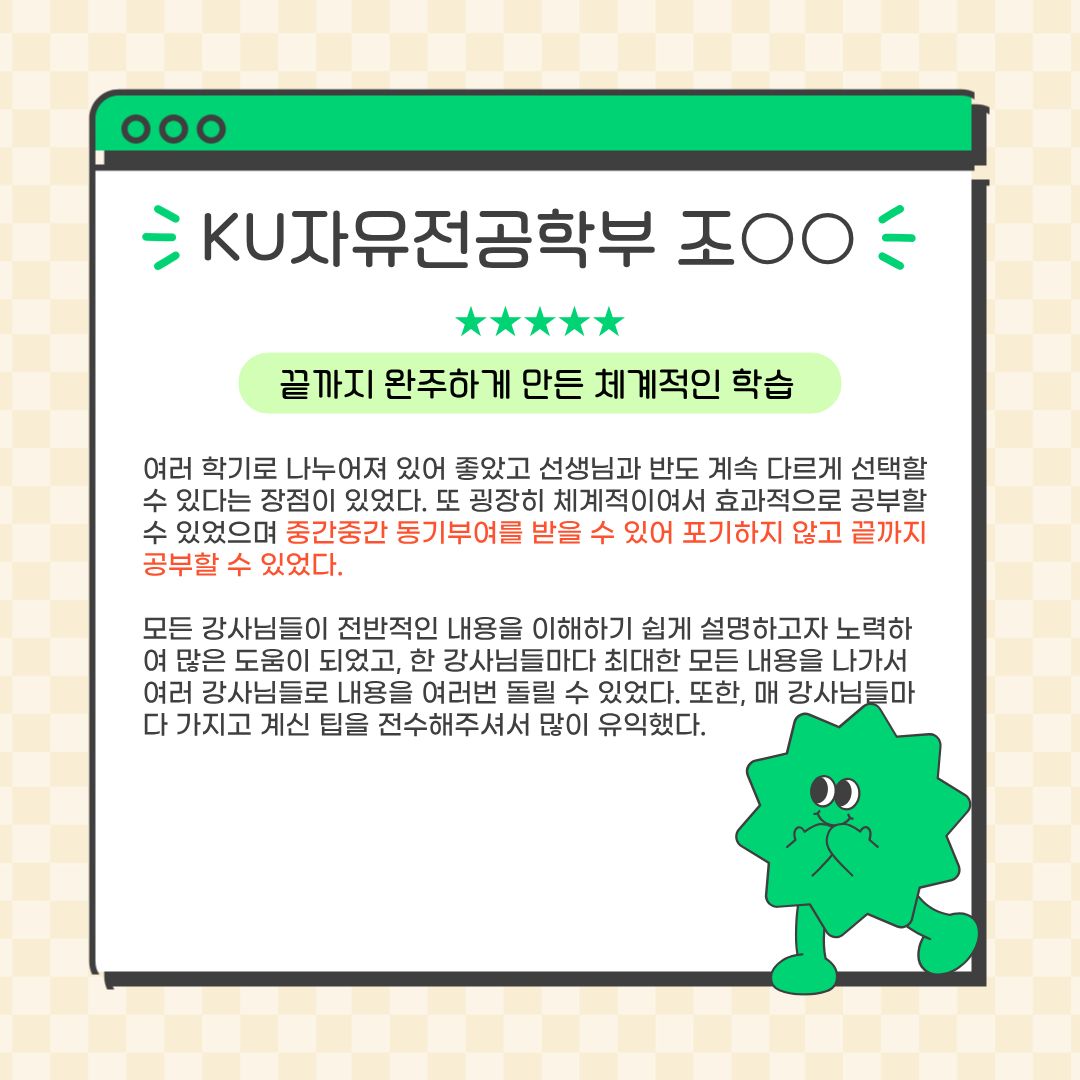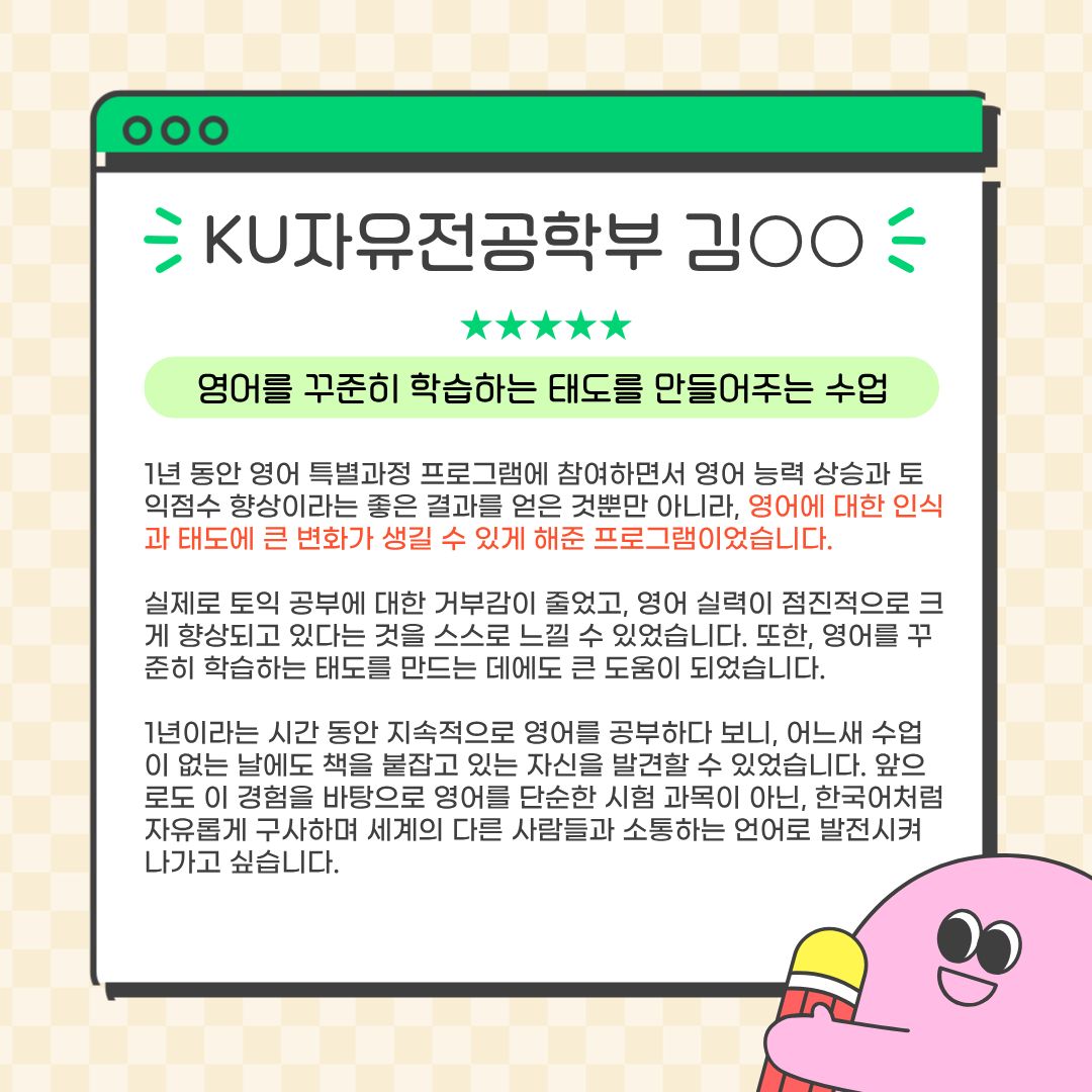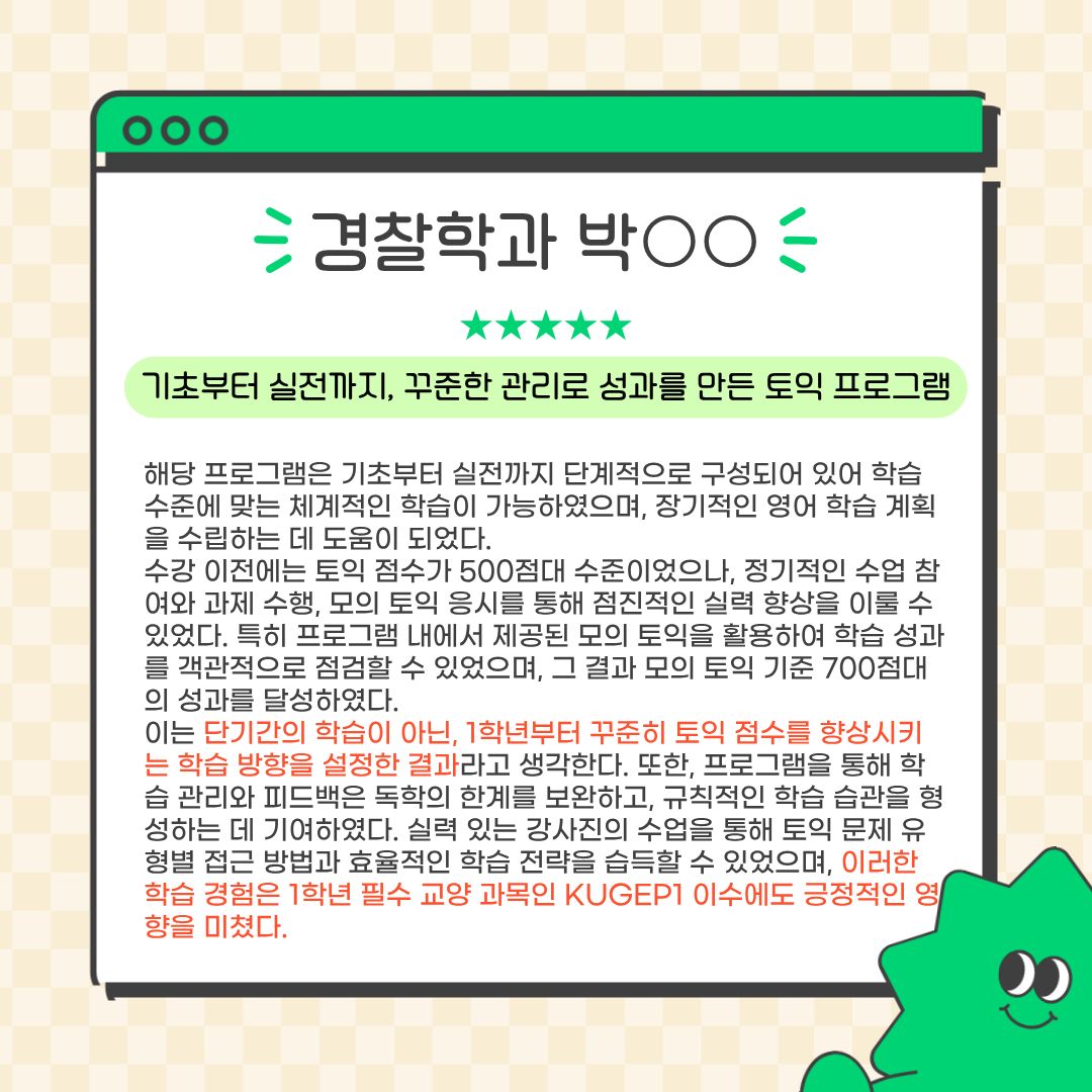 이번 토익 수업을 통해 토익 점수 향상뿐만 아니라 영어 학습에 대한 자신감도 함께 얻을 수 있었다. 무엇보다 막연했던 토익 공부에 명확한 방향성이 생겼다는 점이 가장 큰 수확이다.