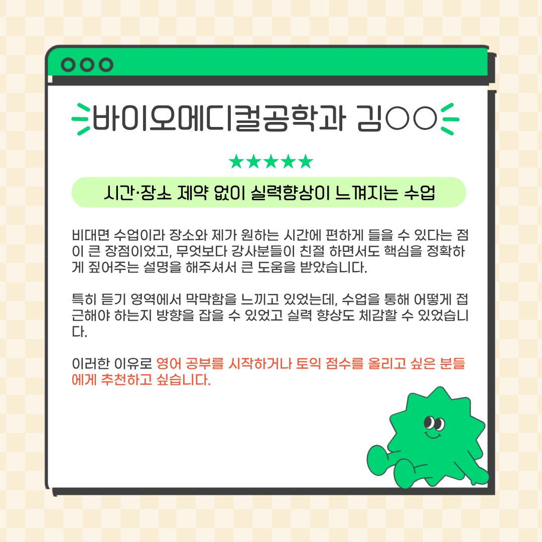 비대면 수업이라는 점이 처음에는 다소 걱정되었지만, 실제로 수강해 보니 오히려 시간과 장소의 제약이 없다는 점에서 큰 장점으로 작용했다. 정해진 강의 시간에 맞추지 못하더라도 녹화 강의를 통해 반복 수강이 가능했고, 이해가 부족한 부분은 여러 번 다시 들으며 학습할 수 있었다. 특히 LC 파트에서는 실제 시험과 유사한 음질과 속도로 연습할 수 있어 실전 감각을 기르는 데 큰 도움이 되었다.